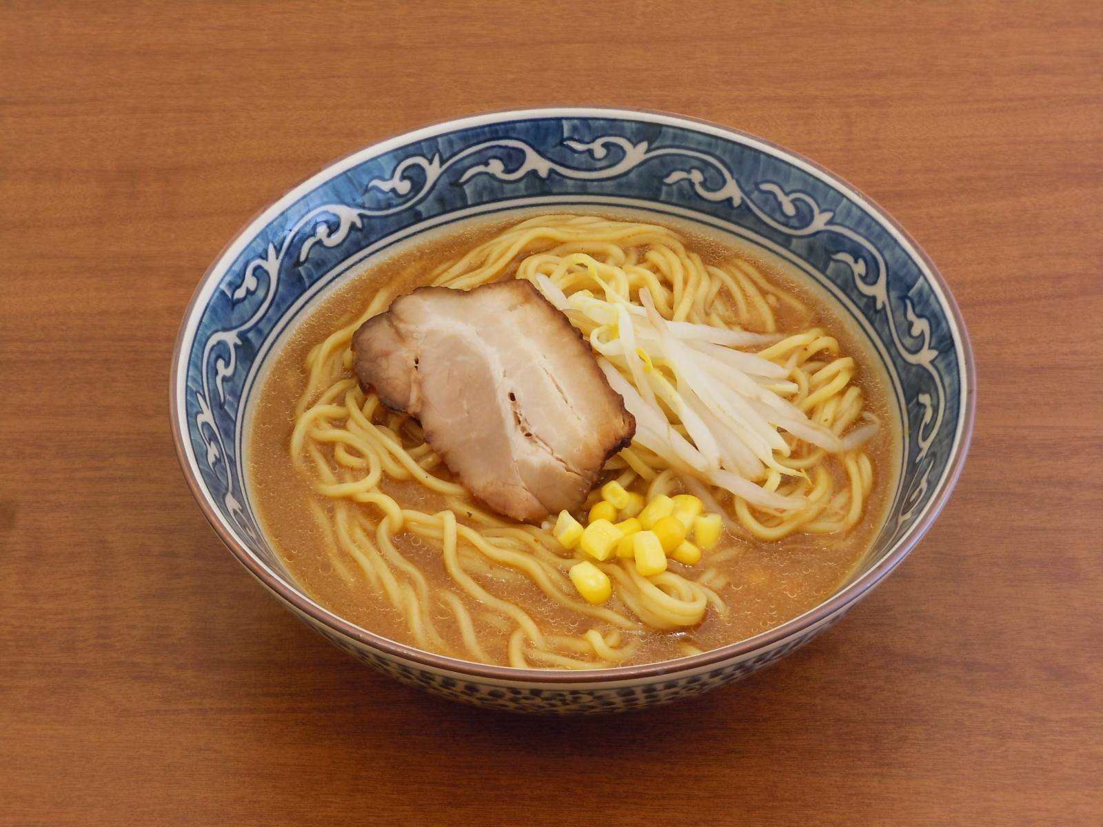 2種類の味噌をブレンドした、深みのあるコクが特徴の味噌ラーメンです。チャーシュー、もやし、コーンの定番具材を盛り付けました。