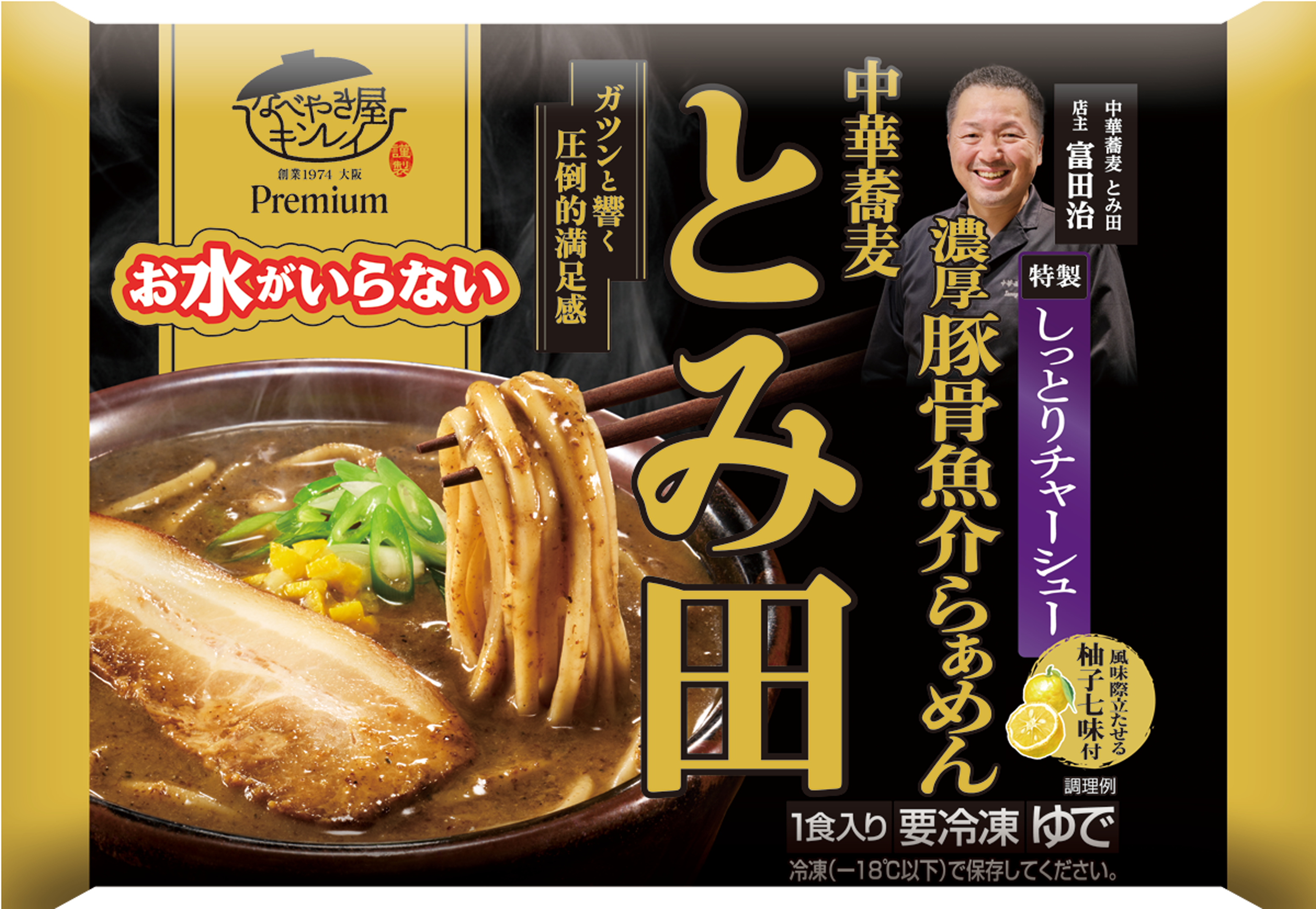 日本を代表するラーメン店である、千葉県松戸の『中華蕎麦とみ田』と作り上げた、キンレイのプレミアムライン第2弾。こだわり尽くした至極の逸品です。スープ、麺、具が一つになっていますので、お鍋に入れて温めるだけでお召し上がりいただけます。
